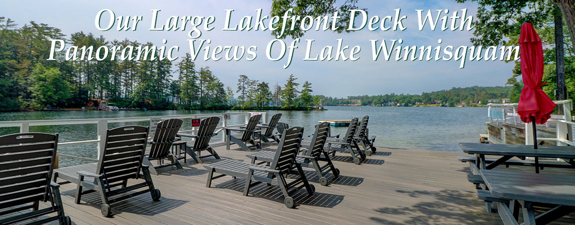 Enjoy quiet lakefront surroundings on beautiful Lake Winnisquam. We are located on 650 feet of private lakefront, and guests love our large deck, which spans over the water. Lounge in the sun or shade and watch a parade of slow moving boats glide by, or just take a step into clear Lake Winnisquam. Near the deck there is a playground, large sandbox and a private swimming area. The water drops off gradually and is safe for young children. The entire property is pleasant and nicely landscaped. All cottages, guest rooms and suites are either waterfront or water view.